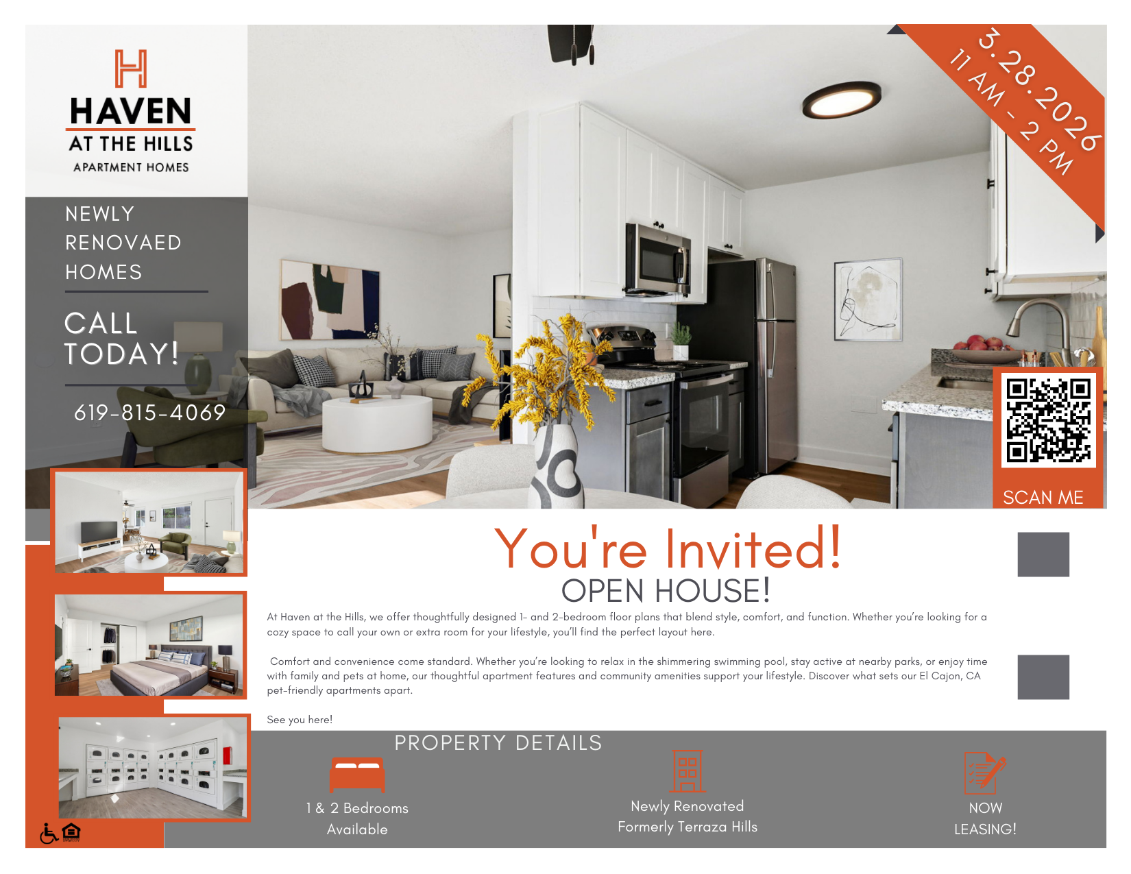 Welcome to Haven at the Hills Apartments—your peaceful retreat in the heart of El Cajon. Choose from spacious one- or two-bedroom apartments in El Cajon, CA, featuring hardwood-style flooring, full stainless steel appliance packages, large closets, ceiling fans, and central air conditioning. Beyond your front door, enjoy a shimmering swimming pool, beautifully maintained landscaping, gated parking, and the convenience of on-site management and maintenance. Located near Izzy’s Café and Parkway Plaza Shopping Mall, and just minutes from schools and major roadways, Haven at the Hills blends everyday comfort with small-town charm. Ready to make your move? Contact us today to schedule a tour.